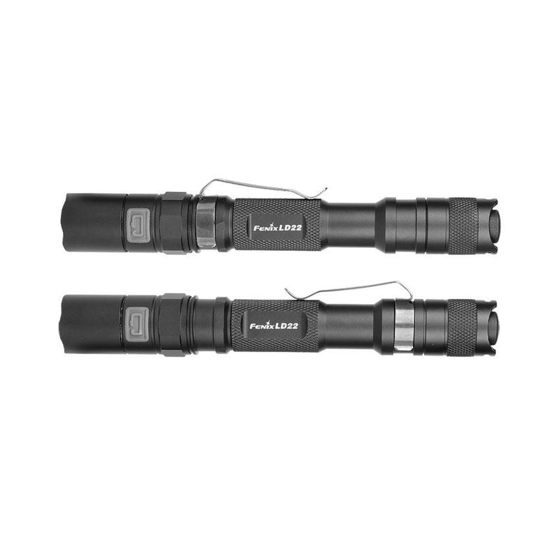 Lampe Fenix LD22 mit 2x AA-Mignon-Alkali-Batterien, Gürtelclip, Gürtelholster, Handschlaufe, Ersatz-O-Ring, Bedienungsanleitung, Garatiekarte.